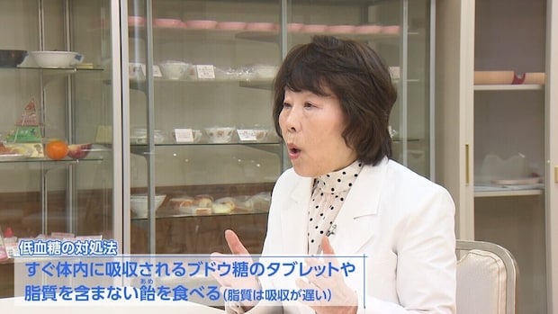 「低血糖になると、手の震えや脱力感、疲労感、けいれんなどの症状が出ることがあります。もし、いつもの自分と違うなと感じたときは、すぐに体内に吸収されるブドウ糖のタブレットや、脂質を含まない飴などを口に含んでください。脂質は吸収を遅らせてしまうので、脂質のない飴を選ぶのがポイントです」