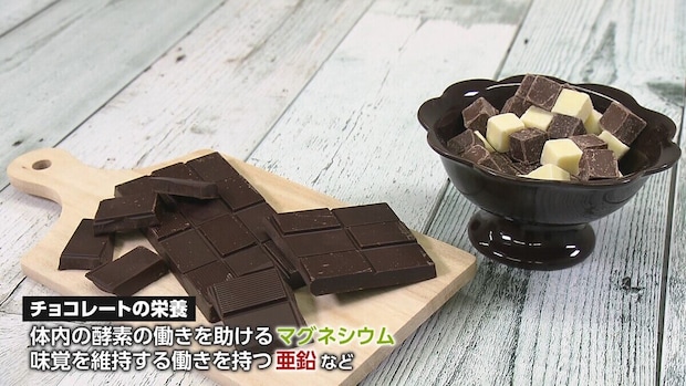 また、チョコレートには体内の酵素の働きを助けるマグネシウムや、味覚を維持する働きを持つ亜鉛などのミネラルが含まれています。