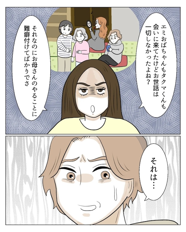 義母に厳しい言葉を浴びせる和也さんをエミさんは咎めましたが、真矢が「エミおばちゃんもタクマくんも、会いに来てたけどお世話は一切しなかったよね?それなのにお母さんのやることに難癖付けてばかりでさ」と指摘すると「それは・・」とバツが悪そうにするタクマくん。
