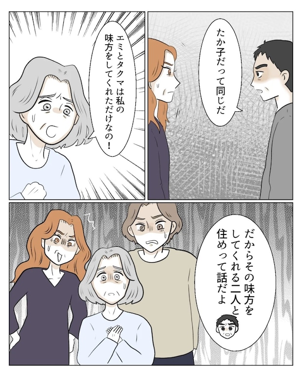 「たか子だって同じだ」という和也さんの反論でエミさんが何も言えなくなると、義母は慌てて「エミとタクマは私の味方をしてくれただけなの!」と二人を庇いました。「だからその味方をしてくれる二人と住めって話だよ」と和也さんがもっともなことを言うと、義母、エミさん、タクマくんの三人は言葉に詰まります。