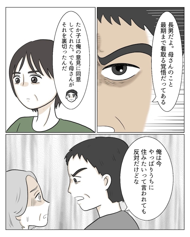 和也さんは「長男だよ。母さんのこと最後まで看取る覚悟だってある。たか子は俺の意見に同意してくれた。でも母さんがそれを裏切ったんだ。俺は今、やっぱりうちに住みたいって言われても反対だけどな」と冷たく言い放ちました。