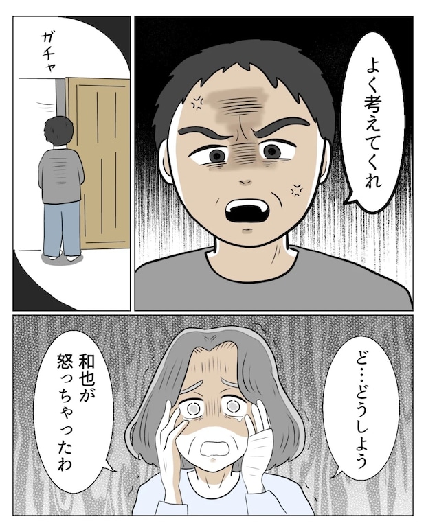 その後、「よく考えてくれ」と言い捨てるように言い、部屋から出て行った和也さんを見て、「ど・・どうしよう。和也が怒っちゃったわ」と義母が動揺しました。