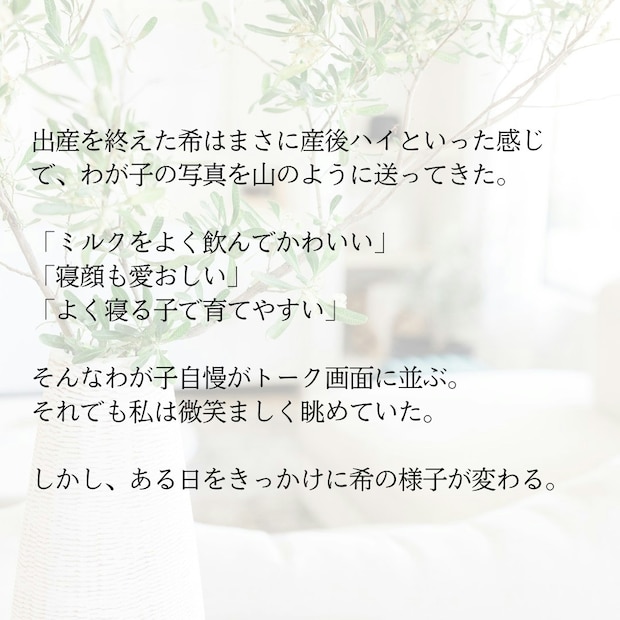 藍子の出産に続いてママになった親友・希。息子の可愛らしさに夢中な様子でしたが、とある発言をきっかけにやり取りは雲行きが怪しくなり、藍子と希の友情は終わりに近づいてしまいました。