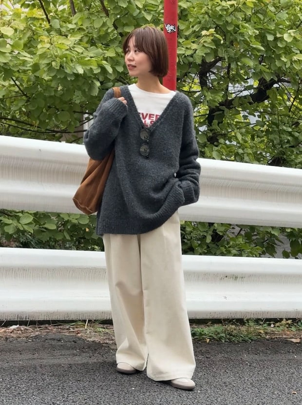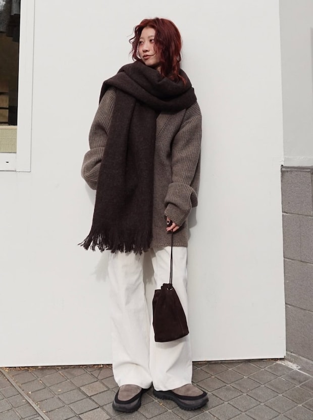 オーバーサイズニットにビッグストールを合わせたボリュームのあるコーデを、軽やかにまとめてくれる白パンの存在感。足元はトップスと色を合わせることで、メリハリのあるスタイリングに決まります。