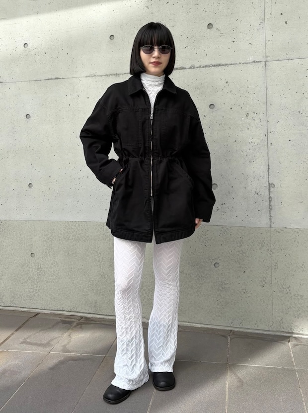 ブラックのアウターの下は、フェミニンさのあるシェル柄のセットアップ。色づかいがシンプルでも、柄でしっかり個性を出しているところも素敵。アウターをキュッとしぼりメリハリをつけることで、洒落感を後押ししてくれます。