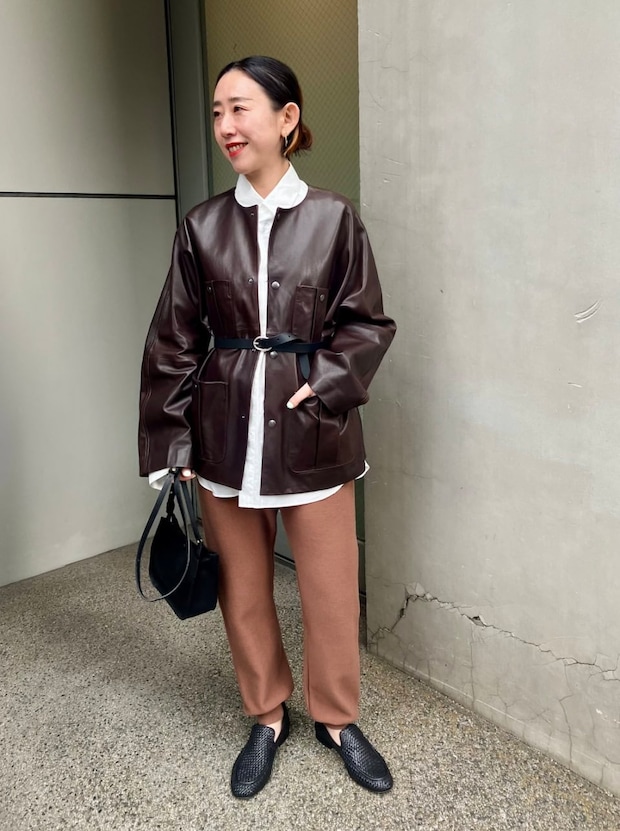 ブラウンコーデをパキッと印象付けてくれる、レザージャケットからのぞかせた白いシャツ。アウターを羽織るとそれだけで終わってしまいがちですが、裾や袖から少し白が出るように意識するだけで、こんなにもこなれた雰囲気が出るなんて!