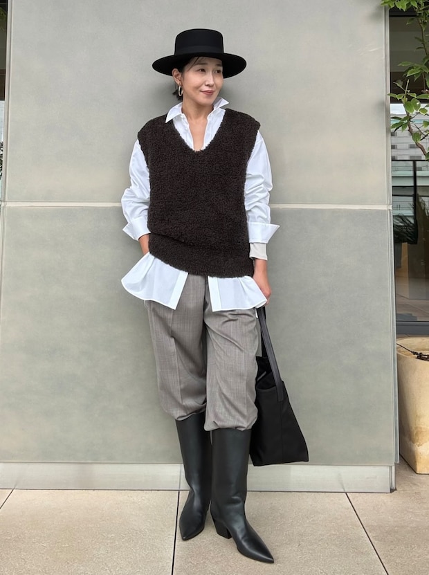 ブーツインしたハンサムなパンツスタイルをラフに落とし込むのは、ベストにレイヤードした白シャツの着こなし方。しっかり見せたデコルテや、サッとまくっただけ、ような計算づくの袖感がスタイリングにヌケをもたらしてくれます。