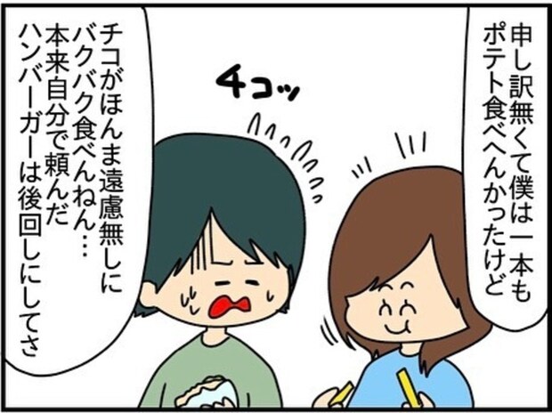 チコちゃんはお構いなしに、ポテトを食べまくります。夫の気苦労が垣間見えますね…。