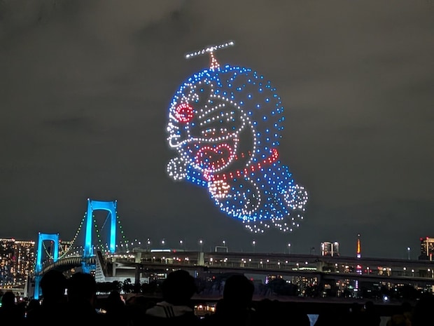 ドラえもん0話に出てくる、皆でタケコプターを使って空を飛んで、のび太だけお尻にタケコプターをつけてしまって、ズボンだけ残される、というストーリーがドローンで再現されました。ドラえもんとのび太、スネ夫、ジャイアン、しずかちゃんの顔、桜の木と合体したドラえもん、ビッグライトで巨大化したドラえもん、などが1000機のドローンで表現。特に巨大化どらえもんは3D化もしていて回転すると立体感がはっきり見えました。