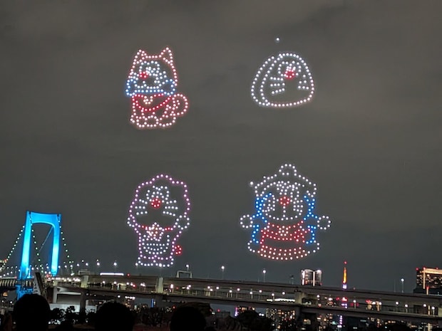このショーを見てまず驚いたのは、前後、空に全くドローンが見えなかったことです。準備で黒い粒が滞空しているのが見えるのかと思っていたのですが、さまざまな形になって光るまで、ドローンの存在感は全くないです。ドローンに限らず、もしかしたらUFOが飛んでいても、光を発していなければ気づかないかも、と思いました。音もしなかったです。