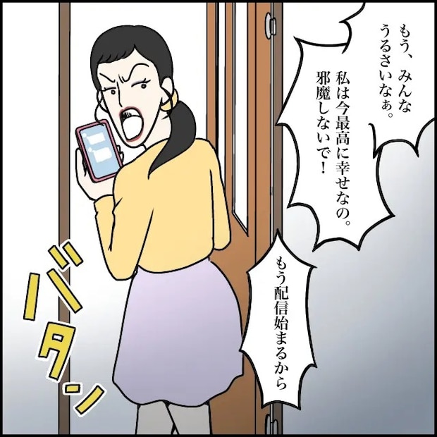玲美さんへの家族の心配がまったく届いていない玲美さんにとっては煩わしい気持ちしかないようで、「もう、みんなうるさいなぁ」とイライラしながら玲美さんが言いました。今最高に幸せだと言う玲美さん。れおくんを放置し、勇也さんが家族のために稼いだお金を使い込んだことを責める真っ当な義両親に「邪魔しないで!もう配信始まるから」と言い捨てて部屋を出て行ってしまいました。