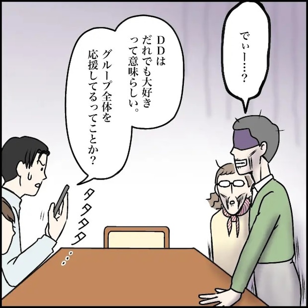 玲美さんは家族のことよりも推しのアイドルのライブの方が気になるようで、勝手に切り上げて席を外そうとしたので、当然怒り出した義父がこれまでどこに泊まっていたのか問いただしました。するとさらりと「同担のとこ。」と玲美さんは答えました。