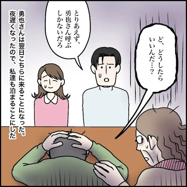 話が通じない玲美さんになすすべもなく頭を抱える義父に、とりあえず玲美さんの夫勇也さんを呼ぶしかないと太一の意見で、翌日来てもらうことになりました。私たちもその日は義実家に泊まりました。