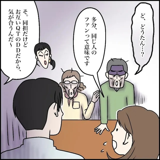 「同担」などという言葉が出てきて動揺する義両親に、私は「同じ人のファンって意味です」とフォローしました。ファン同士のコミュニティにもしっかり入り込んでいる様子の玲美さんにも、良く知らない人の家に泊めてもらっていたことも意外です。そうとうのめり込んでいるのだなということだけはよくわかりました。