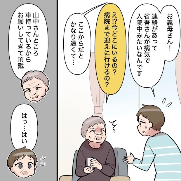 「お義母さん!連絡があって、省吾さんが病気で入院中みたいなんです」そう伝えると、義母は驚いた表情で「今どこにいるの?病院まで迎えに行けるの?」と身を乗り出すように聞いてきました。あんな別れ方をしても、義母は息子の顔が見たいようです。私は近所の人に頼んで車を出してもらい、省吾さんを引き取りに行くことにしました。