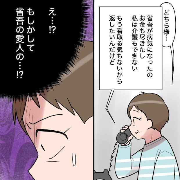 「どちら様・・・」そう言いかけた私の言葉を遮るように、女性は一方的に話し始めました。「省吾が病気になったの、お金も尽きたし私は介護もできない、もう看取る気もないから返したいんだけど」彼女の話を聞いた途端、私は電話の相手が省吾の愛人だとすぐに分かりました。