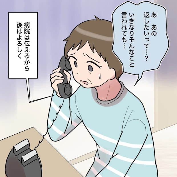 「あ、あの返したいって?いきなりそんなこと言われても・・・」あまりに突然のことで頭が真っ白になりながらも、私はなんとか言葉を絞り出します。しかし彼女はまったく取り合おうとせず、「病院は伝えるから、後はよろしく」そう言い残すと、一方的に電話を切ってしまいました。