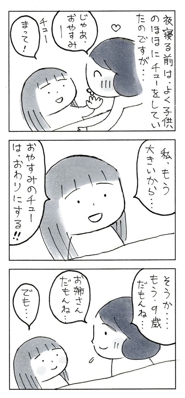 なりたりえ(@rienarita)さんの投稿です。なりたりえさんは、寝る前には必ず娘さんのほっぺに チューをしていたそうです。しかし、ある夜、いつものように「おやすみ」と言ってチューしようとしたところ…。