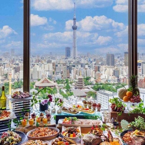 会場は浅草ビューホテル26階「スカイグリルブッフェ 武藏」。高層階のフロアいっぱいに広がるダイニング。窓際には浅草の街と東京スカイツリー方面の景色。