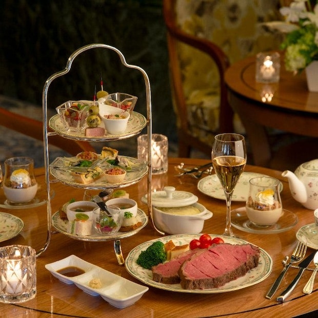 三段のオードブルスタンドには、「鴨とオリーブ ポレンタフリットのピンチョス」をはじめ、「ずわい蟹と白アスパラガスのピュレ」や「フォアグラと鶏むね肉の苔玉」など、種類豊富なこだわりのセイボリーが勢揃い。メインには、ボリューム満点のシェフ特製ローストビーフが提供されるので、お腹も心もしっかりと満たされるはず。そして食後は、濃厚な「ほうじ茶のムース」で締めくくりを。