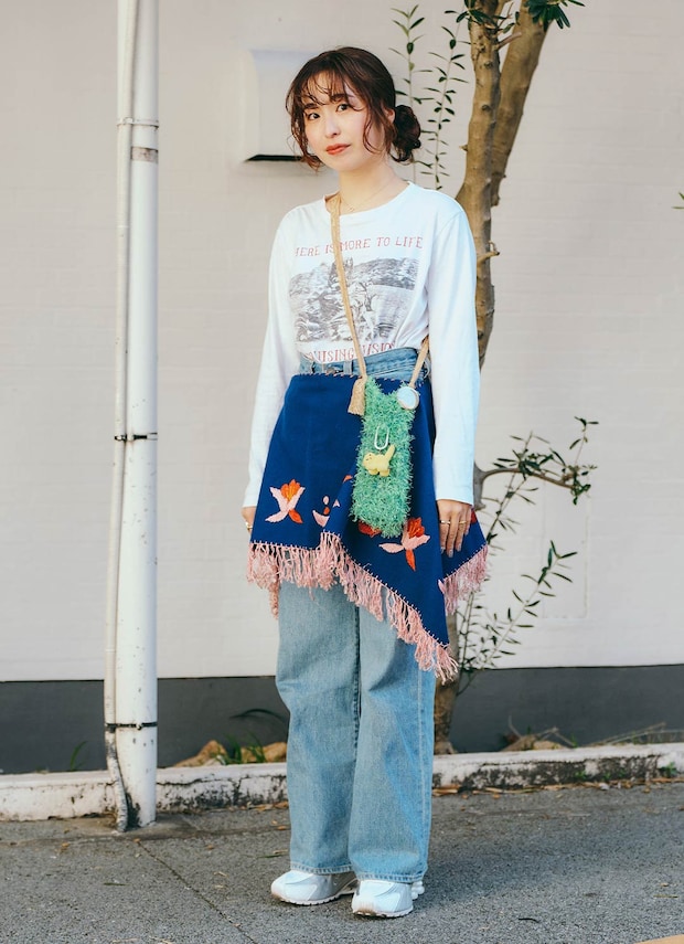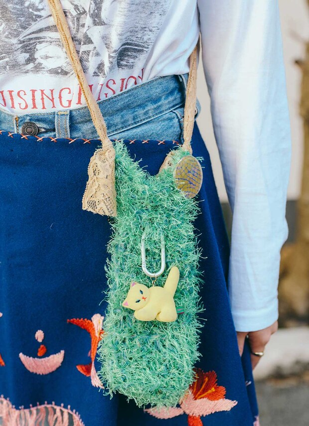 ハンドメイドのバッグはファー素材で装いに立体感をプラス。チャームやバッジでオリジナリティを発揮したのがグッド♪