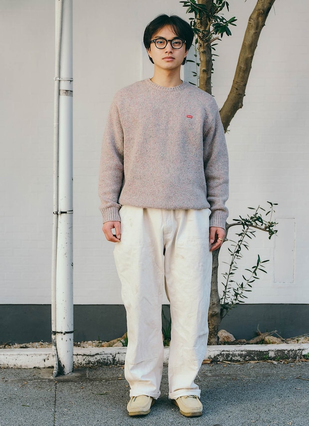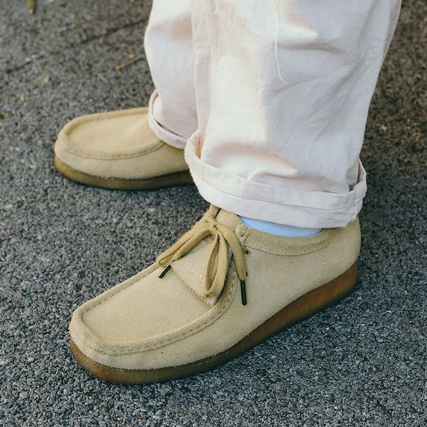 『クラークス』のワラビーはライトベージュで軽やかさを演出。ロールアップして全体のバランスを取ったのがお見事!