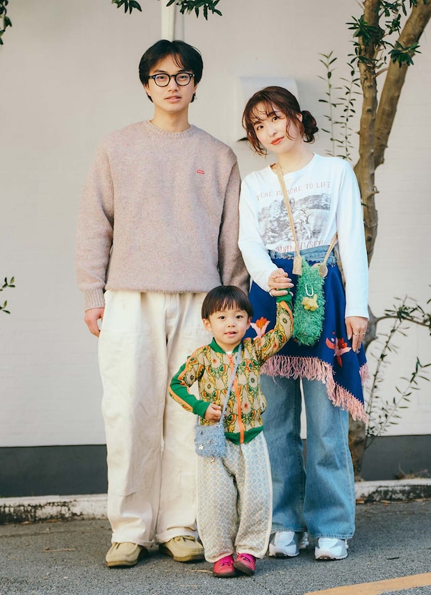 淡いトーンにエネルギッシュなグリーンやレッドを挿して、春ムード満載な家族コーデが登場! ヴィンテージやハンドメイドアイテムを上手く取り入れて、こなれ感を漂わせたのがポイント。キッズのメリハリある柄MIXコーデはぜひお手本にしたい。