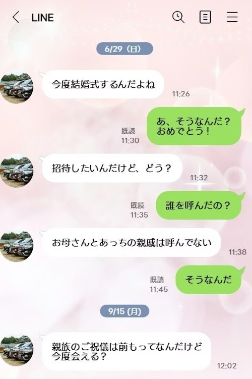 と春ごろLINEが来ており、そこから連絡取ってなかったのですが、9月末に式なのでそろそろ来るかなと思ったら案の定数日前に「会える?」と連絡が来ました。