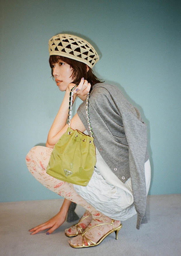 持ち手に大粒のビジューが並ぶライム色の巾着、ロゴと同じトライアングル模様に編まれたクロシェバッグ、小花柄のタイツ、華奢なゴールドのストラップサンダルetc.。女の子の憧れが詰まった宝石箱をひっくり返したかのような、キラキラしたときめきを纏っているプラダのプレフォールコレクション。上質さに裏打ちされた、“可愛い”の魅力に完全にノックアウト! いち早く手に入れて、夏からさっそく愛用しよう。