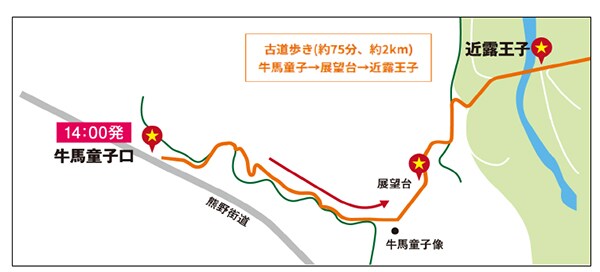 聖地巡礼バス利用者限定のオプショナルツアー、“赤リュック語りべとのウォークプラン「牛馬童子~近露王子」”も用意。
