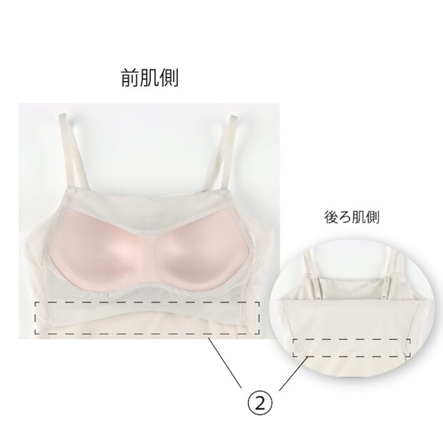 また、胸もとが見えにくいよう高めのネックラインとし、背中のラインをフラットにしてうしろ姿もすっきりきれいにととのえることで、制服や私服のインナーとして着用しやすいブラトップに仕上げています。