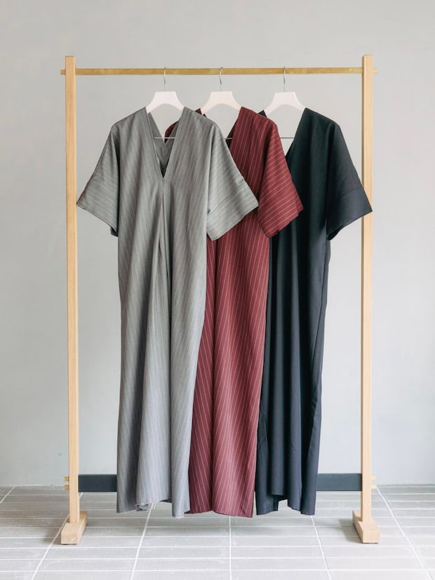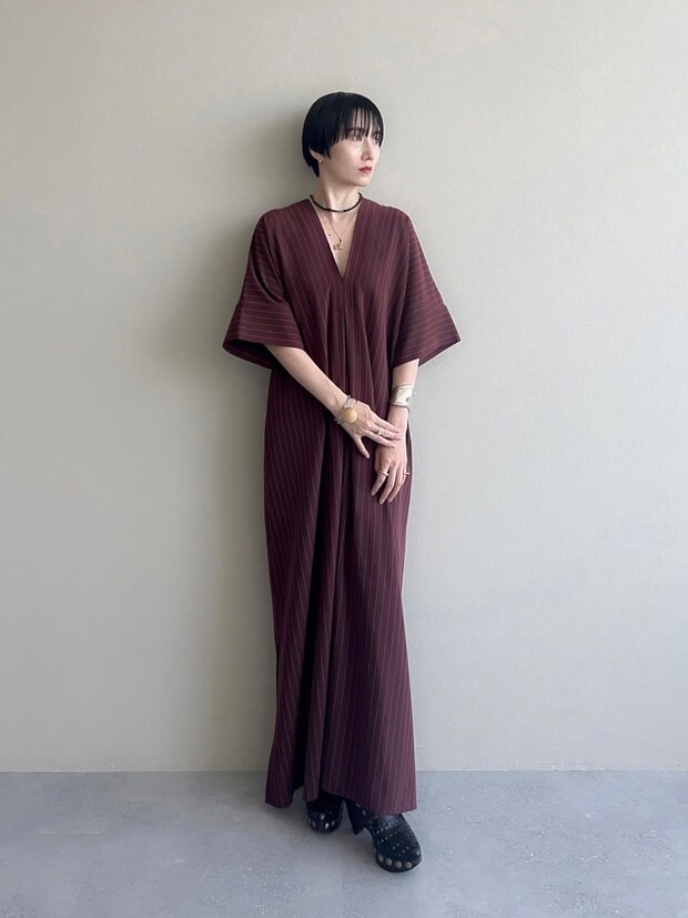 「夏から初秋まで活躍するブラウンのピンストライプ柄のロングドレスを主役に、印象的なアクセサリーを重ねづけすることで手元や首まわりに個性とアクセントを加えました。ボリューム感がありポイントになるシューズを合わせて、リラックスし過ぎずモードな雰囲気に」