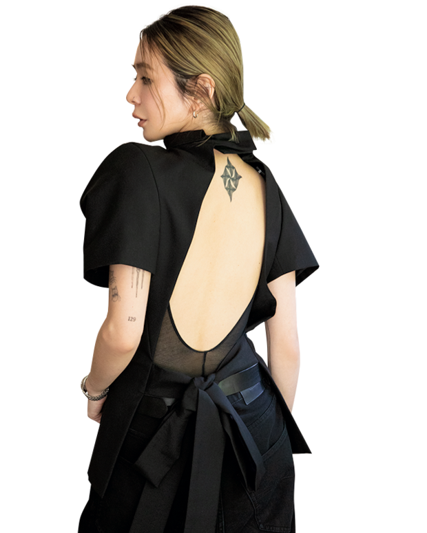 「フォルムがユニークなアイテムに惹かれます。ナイジェリアとブラジルにルーツを持つデザイナー、トリシェジュのトップスは、実はホルターネックのようにも着用可。インナーのランジェリークは着心地がよく、会う人みんなにオススメしています」