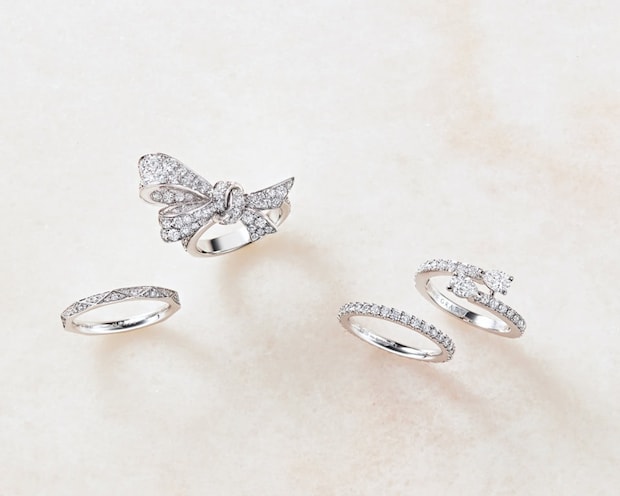 右から:〈デュエット〉[WG×DIA]¥1,290,000、〈クラシック グラフ〉[WG×DIA]¥660,000、〈ティルダズ ボウ〉[WG×DIA]¥2,270,000、〈ローレンス グラフ シグネチャー〉[WG×DIA]¥523,500(全てグラフ/グラフダイヤモンズジャパン)