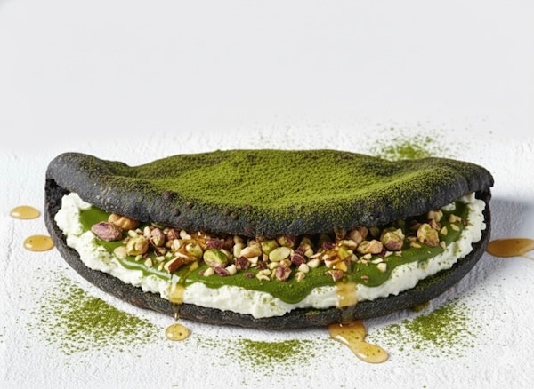「抹茶クリームのデザートピザ」は、竹墨ブラック生地に抹茶クリームを合わせたデザートピザ。甘さは控えめに仕上げ、抹茶の香りとコクを引き立てる構成となっている。
