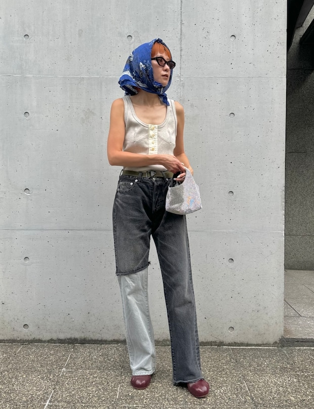 サングラス×スカーフ使いでシンプルスタイルにエッジを。「キャットアイ風のデザインとレンズのカラーが気に入っているSTELLA McCARTNEYのサングラス。変形したデザインが特徴的なので、スタイリングのポイントになり重宝しています」
