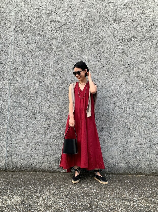 サングラスでエッジをきかせてナチュラルムードをモダンに。「天然繊維の心地よいスタイリングを、ナチュラル見えしないようややモードなカラーリングでまとめました。サングラスでよりシティムードをプラスしています」