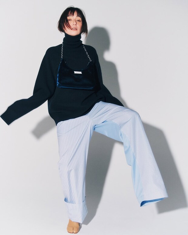 バッグ〈「グラム スラム」ホーボー スモール〉[H21×W28×D6㎝]¥301,400、ブーツ〈「タビ」ブーツ〉[ヒール8㎝]¥189,200、ニット¥214,500、パンツ¥152,900、ピアス¥41,800(全てメゾン マルジェラ/マルジェラ ジャパン クライアントサービス)
