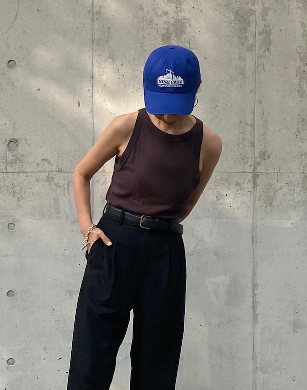 キャップ¥7,920(シップス ナインケース)、ノースリーブトップス¥7,700(オニット × シップス/共にシップス インフォメーションセンター)、COCUCAのパンツ、THE ROWのベルト、HERMÈSのブレスレット、TKEESのサンダルは本人私物