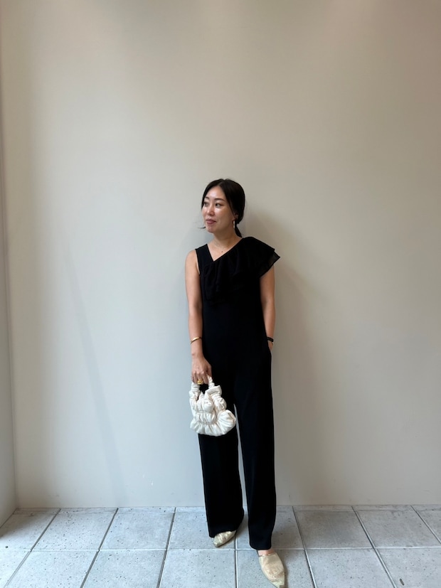 「さらっと着られるニットコンビネゾン。腰に巻いても肩に巻いても使えるフリルのつけ襟を斜めにつけてアクセントにしました。ギャザーディテールがユニークなホワイトのバッグ、メッシュ素材のサンダルを合わせて、重くなりがちなブラックスタイルに夏らしさをプラス」