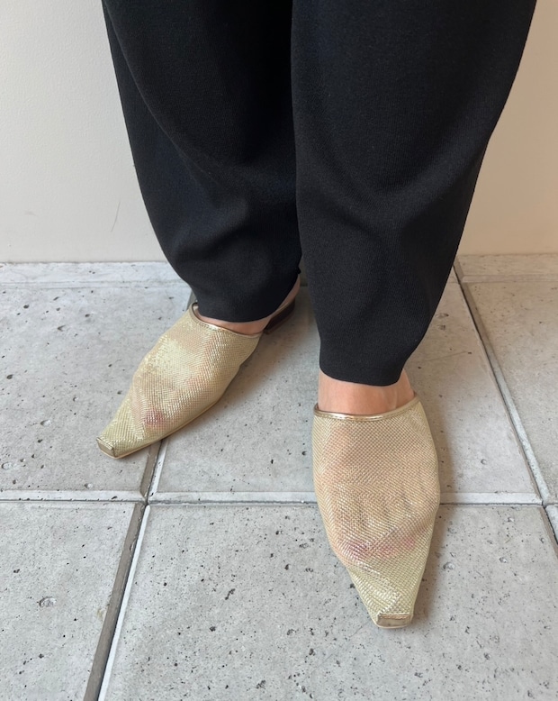 「このメッシュサンダルはリバイバル商品なのですが、私は2回目のリピート。絶妙なラメ感がコーディネートのワンポイントとなるので本当にヘビロテで使用してます」メッシュサンダル¥19,800(アメリ/アメリヴィンテージ)