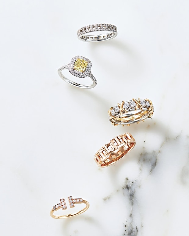 上から:〈ティファニー T トゥルー〉[WG×DIA]¥913,000、〈ティファニー ソレスト〉[PT×イエローダイヤ1.12ct×DIA]¥2,805,000、〈ジャン・シュランバージェ16ストーン〉[PT×YG×DIA]¥2,200,000、〈ティファニー T トゥルー〉[RG]¥346,500、〈ティファニー T〉[RG×DIA]¥412,500(全てティファニー/ティファニー・アンド・カンパニー・ジャパン・インク)