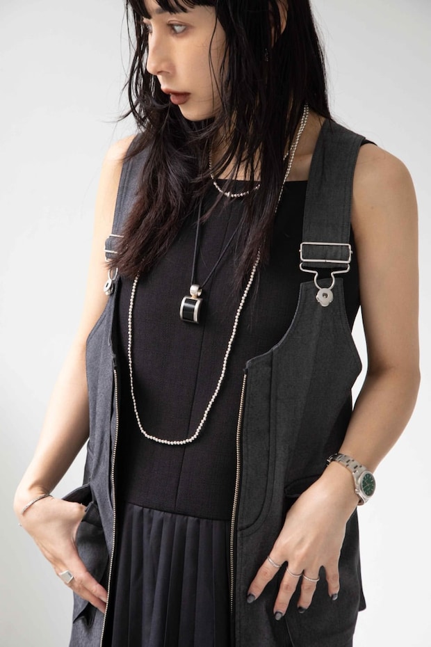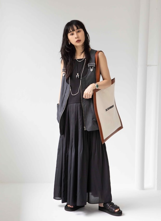「夏こそのシックなブラックトーンでまとめました。ウエストで切り替えになったロングドレスはワークベストとセットになっていながらも、カジュアル過ぎず気に入っています。ベストはフロントジップをあけてジレのように羽織り、シルバージュエリーをきかせました」