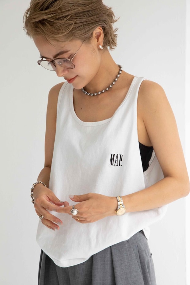 「オーバーラップクロージングのオリジナルブランドmap.(マップ)のロゴタンクトップはトラッドにもスポーティにも振れるシンプルなデザインがお気に入り。大きくあいた袖ぐりからインナーを覗かせるのがポイント」タンクトップ¥7,700(マップ./オーバーラップクロージング)