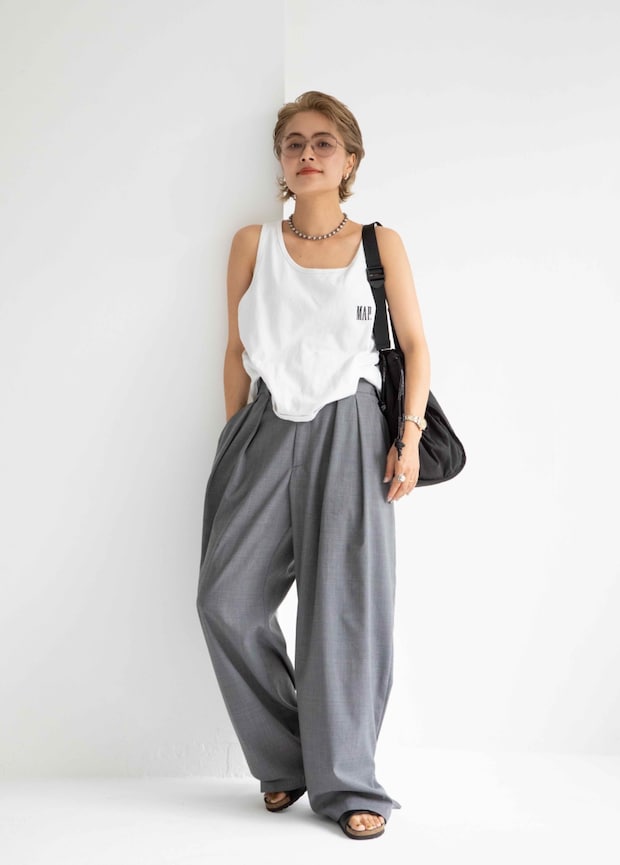「ボックスシルエットのスポーティなロゴタンクトップとキレイめなタック入りのワイドスラックスを合わせたMIXスタイル。シンプルなワンツーコーデにならないよう、シルバージュエリーをきかせたり、スポーティな小物を合わせたりとスタイリングにリズムをプラスしました」