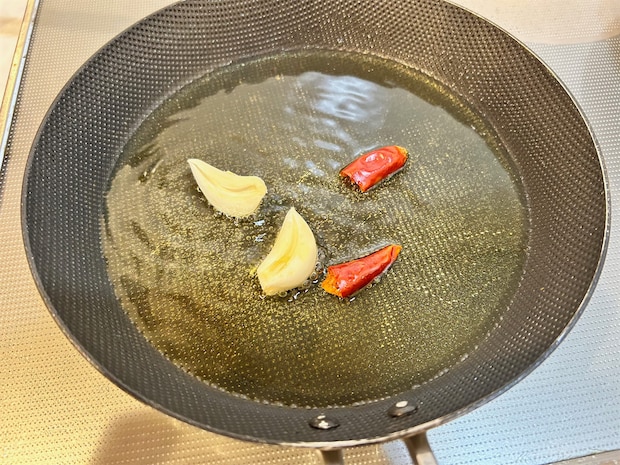 2. フライパン(今回はそのまま食卓に出せるよう、小さめのものを使用)に、オリーブオイルの半量と、1のにんにくと鷹の爪を加えて中火にかける。