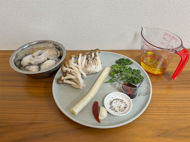 冷凍牡蠣は半解凍(または解凍)し、キッチンペーパーで水気を拭いておく。