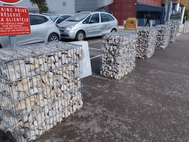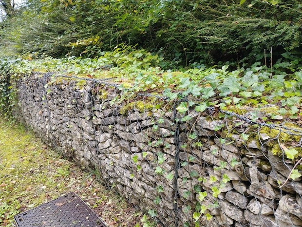 そんなポイントをカバーするのでしょうか、太い針金を編んで造るいわゆる蛇籠式の枠の中に自然の石を詰め込んだ仕切りを良く見かけるようになって久しくなりました。