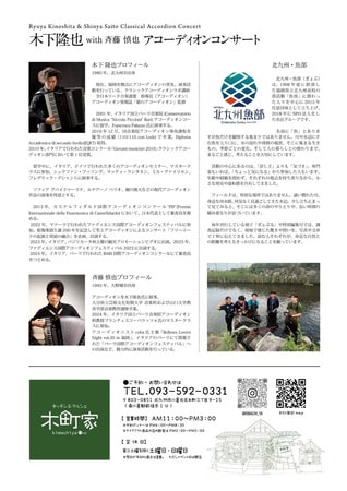 コンサートには、アコーディオンを木下隆也氏に師事している斉藤慎也氏も出演。会場となるのは、南小倉駅そばのカフェ「キッチン&マルシェ 木町家」だ。