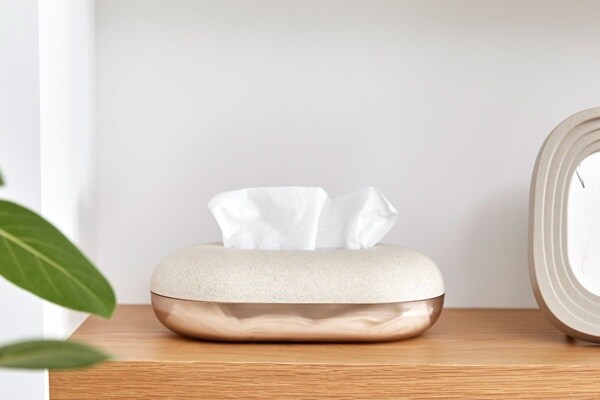 「Tissue case fold」は、ボックスティッシュを詰め替えて、すっきりと置けるティッシュケース。軽やかなツートーンデザインは、残量をさりげなく確認できる。ティッシュを二つ折りにして収めることで、ボックスティッシュそのままよりも省スペースに。